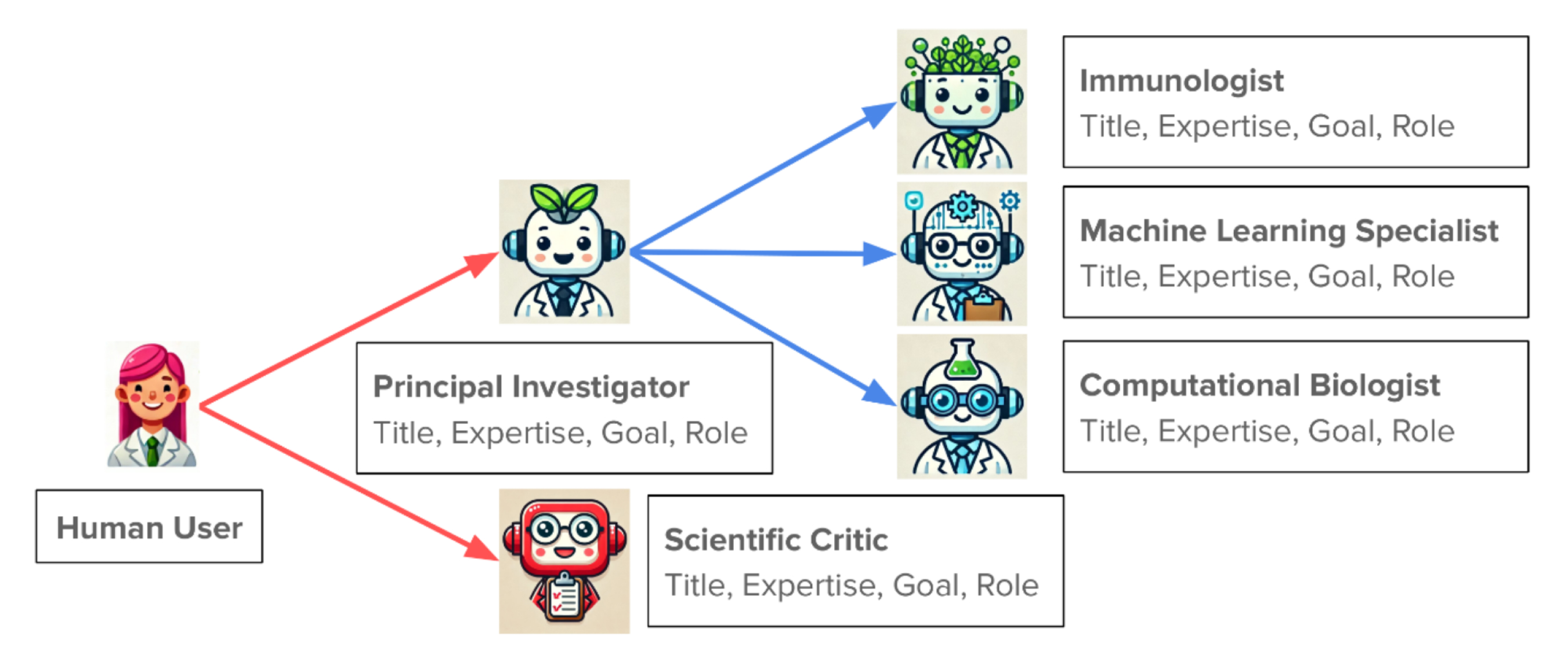 This prompt also directs the PI agent to select a team of three “expert” agents to help with the project. The PI agent should define these agents the same way it was defined (with a title, goal, area of expertise, and role in the project). For the COVID-19 demonstration, the PI opted to collaborate with an immunologist, a machine learning specialist, and a computational biologist.