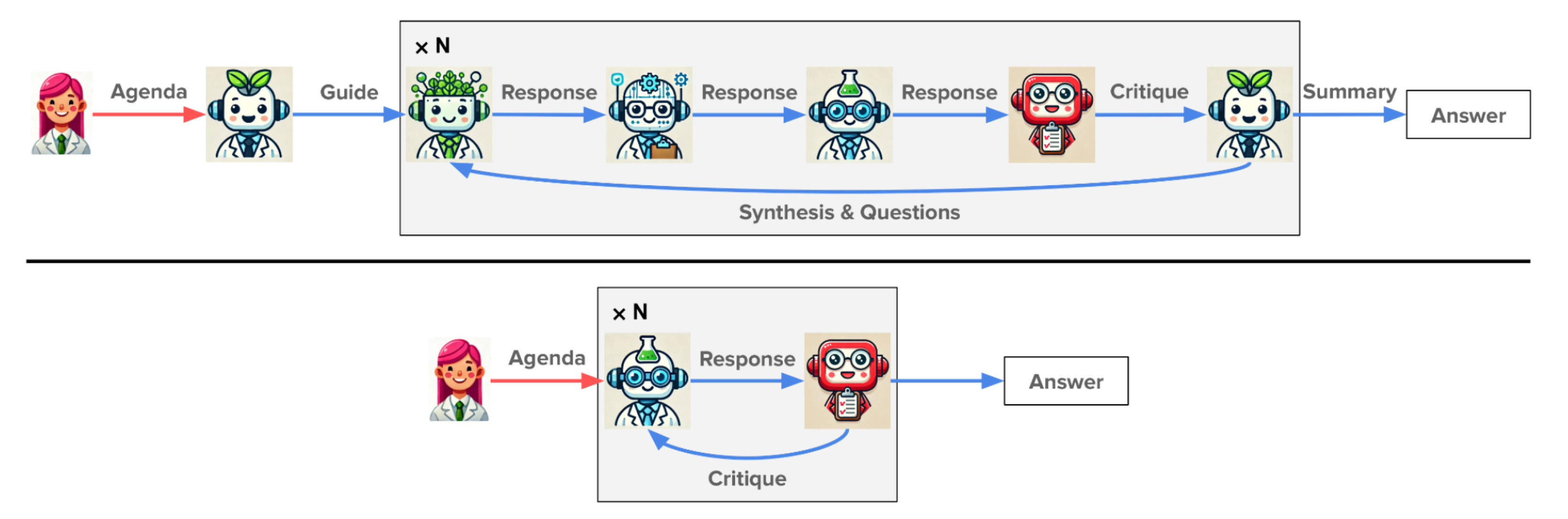 At the end of each round of discussion in a meeting, the SC generates a critique of the expert agents’ responses. The PI then asks follow-up questions for the next round based on the discussion so far. The process repeats for however many rounds the scientist set in the agenda—the Stanford team usually opted for three rounds, leading to meetings lasting about 5-10 minutes.