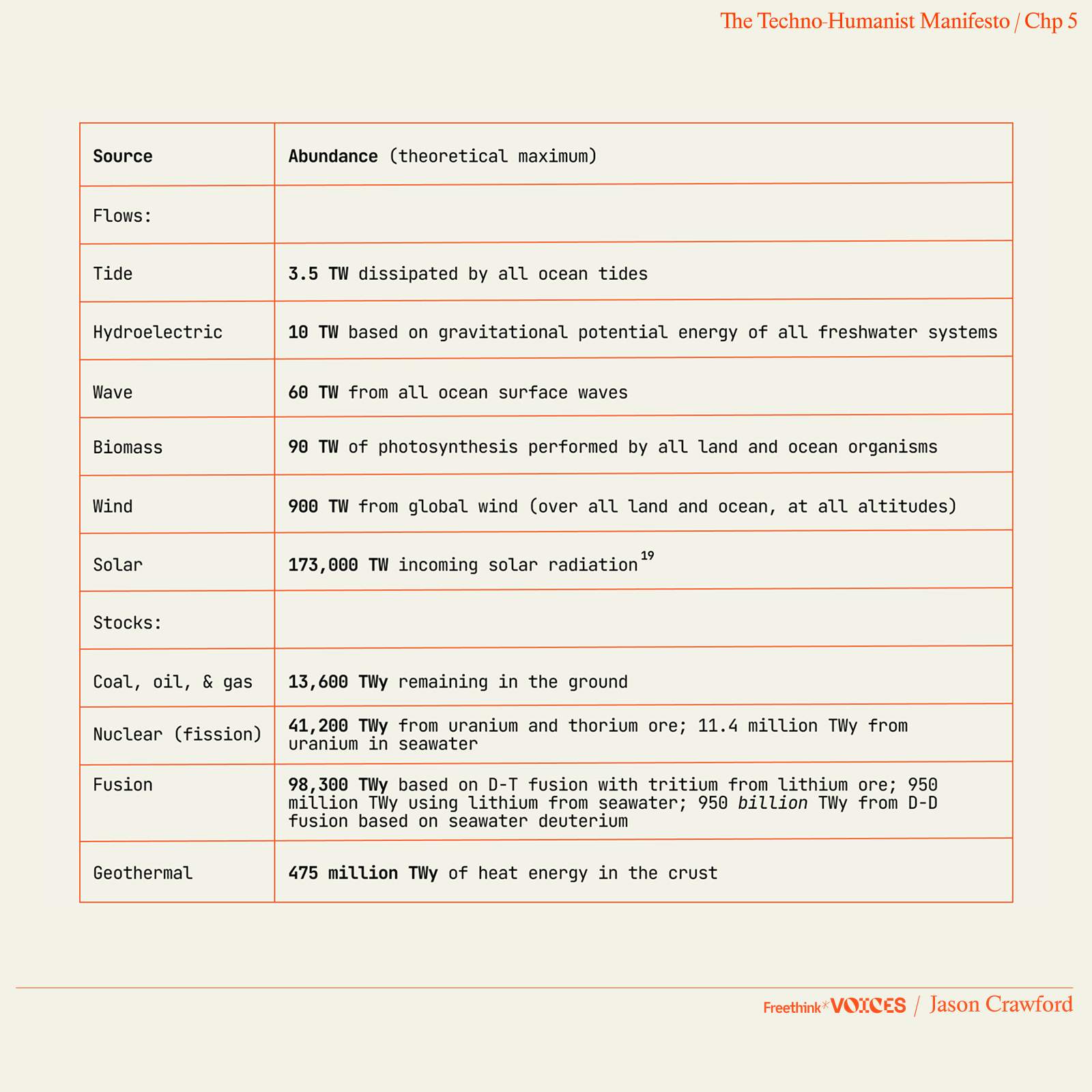 Here’s the theoretical maximum energy available from various sources, divided into those best considered as renewable flows, vs. fixed stocks that we draw down.18 For context, total world energy usage today (not just electricity, but all forms of energy) is roughly 20 TW: