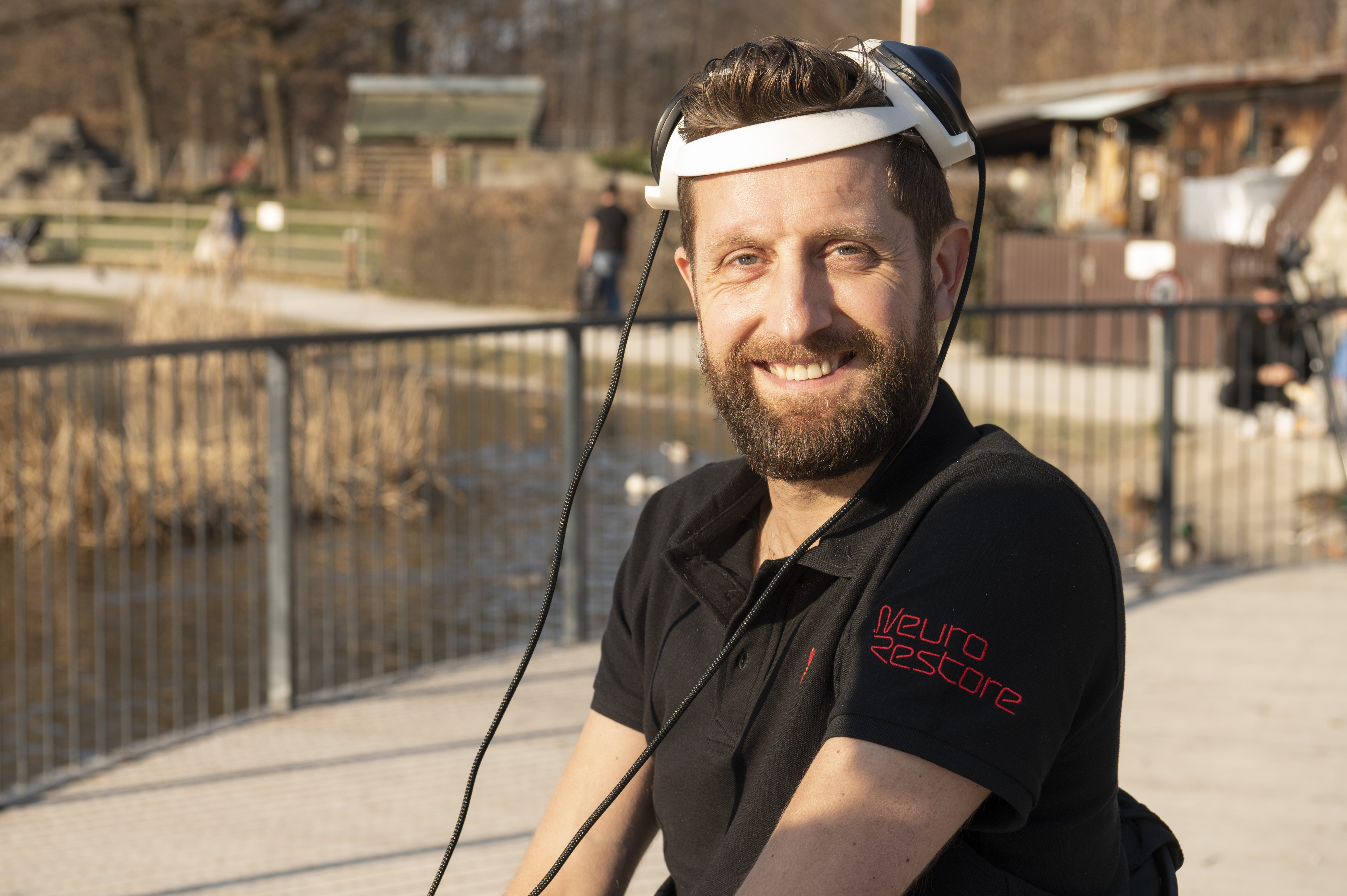 Now, when he thinks about walking, the brain implants transmit the signals wirelessly to receivers in a helmet. From there, the signals are sent to a computer that Oskam carries around in a backpack.