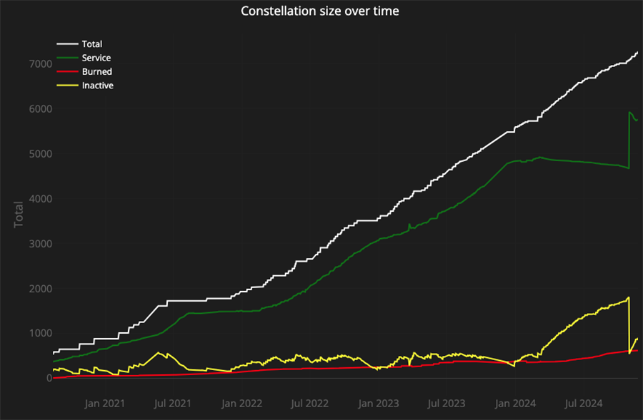 Line graph titled "Constellation size over time" shows total, service, burned, and inactive data from Jan 2021 to Oct 2024. Total and service lines gradually rise; burned and inactive lines remain low.